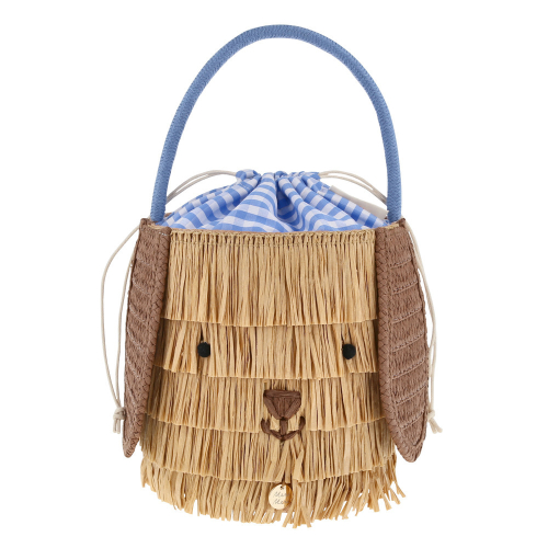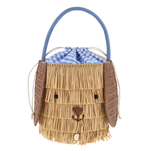 Woof, woof! This adorable puppy basket is definitely something to bark about! Woven from natural color paper based raffia, it features floppy ears, pompom eyes and a sweet embroidered face. Lined in blue and white gingham with a handy drawstring top, it is beautifully finished with a blue cord handle and playful fringe trim. A chic everyday bag or perfect for storing treasures.