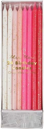 Unwrapping presents, cake, blowing out candles... Some things never lose their appeal, no matter how many birthdays pass you by, so why not add a little extra touch of color to your party with this set of twenty-four pink candles, in a range of six shades from ice to magenta, all decorated with gold glitter.