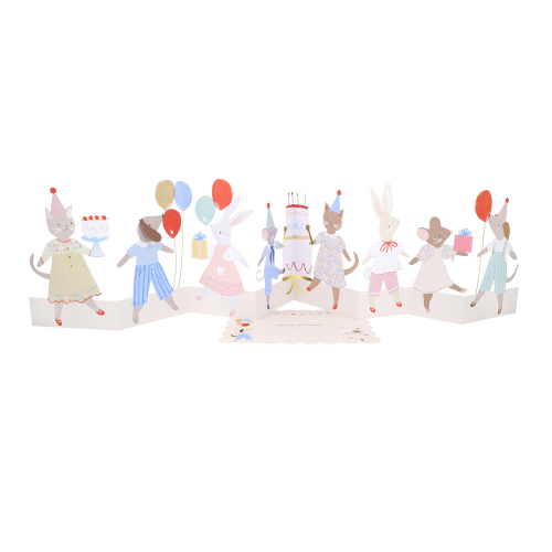 Adorable animal alert! This birthday card is the perfect way to send your best wishes for early years and first birthdays. Inspired by vintage fashion illustrations and color palettes, with shiny metallic gold threads and pops of red to keep the look current. This concertina card opens out to reveal happy animals with balloons on parade, ideal to decorate a window sill, table or mantel, to fill the room with joy.