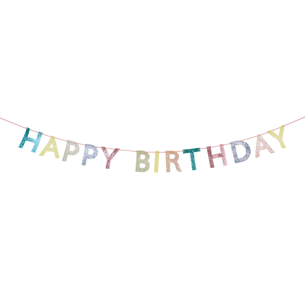 Add sparkle and style to every birthday with this dazzling Happy Birthday garland. The chunky glitter fabric pennants come in a joyful mix of colors, each backed with thick felt to keep their shape celebration after celebration. Strung on a soft pink velvet ribbon for easy hanging, from windows to walls or above the mantel, it is a decoration to treasure.