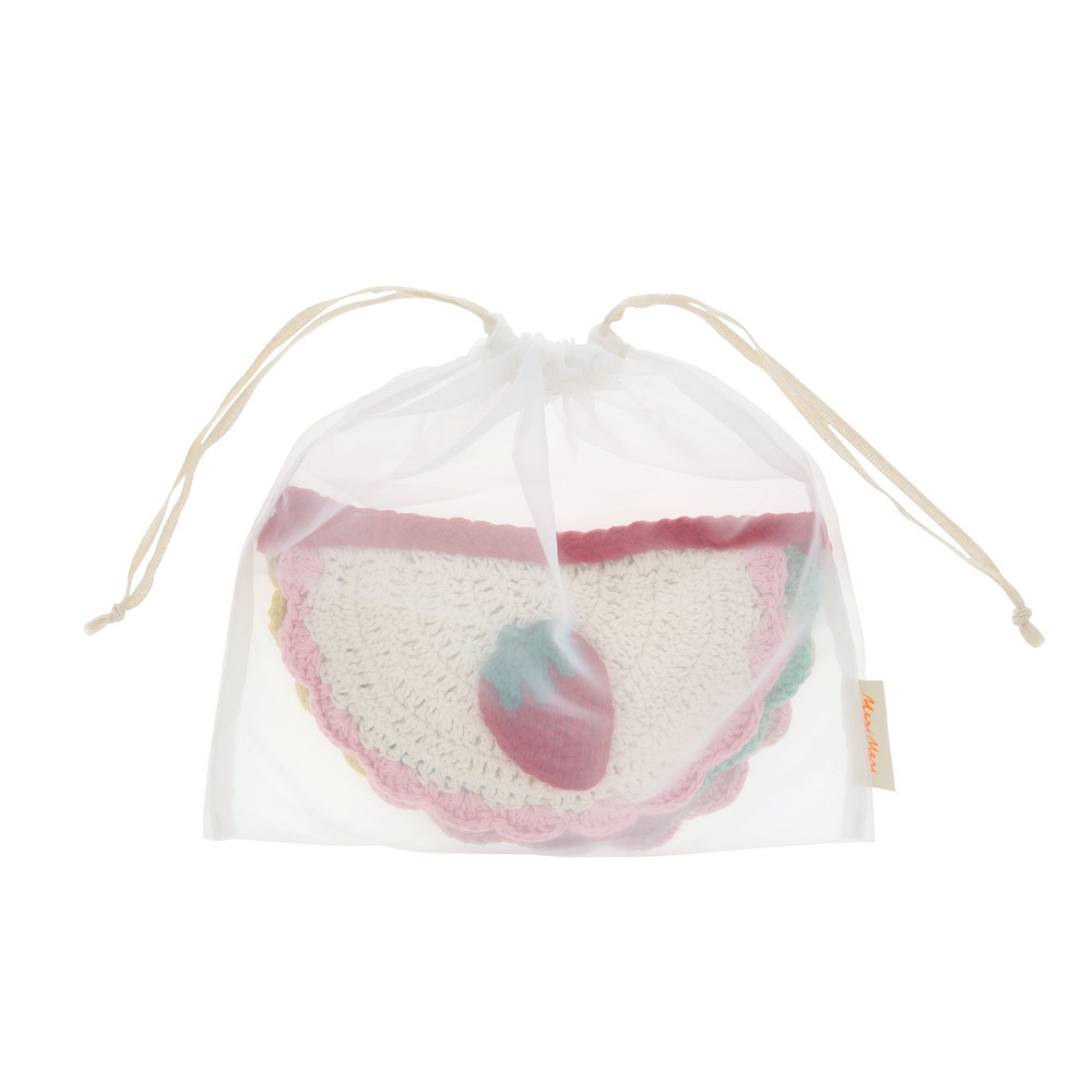 Add moments of magic to your table or room with this delightfully hand-crafted crochet scalloped garland, a charming way to bring this popular craft to your celebrations. Made from soft cotton yarn, it features six ivory semi-circle pennants attached with a red chain stitch. It comes beautifully presented in an organza drawstring bag, ideal for stylish and safe storage.