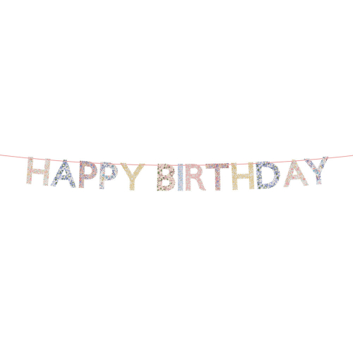 Meri Meri has teamed with Liberty to give you the “Happy Birthday” paper garland. The combination of classic Liberty floral prints, both on the garland and the box, with a soft pink velvet ribbon add a sophisticated twist. This is the perfect scalloped garland to use for stylish celebrations for all ages. Hang it on the party table, on the wall, in the window or on the porch, or wherever you want maximum effect.