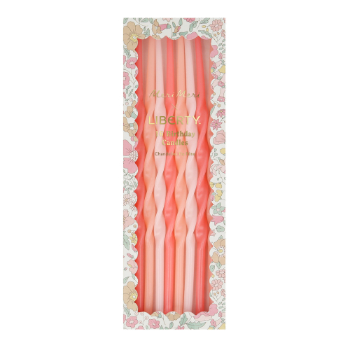 Set an unforgettable scene for your party with our exclusive elegant candle set, crafted in collaboration with Liberty, the iconic London department store. The combination of the twisted shapes, with shades of peach and pink, will instantly add statement to your celebrations. Perfect for any occasion where you want soft pink and peach tones, like a princess party or fairy party. These birthday candles are beautifully presented in a matchbox-style box with a Liberty print design.