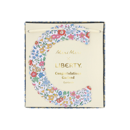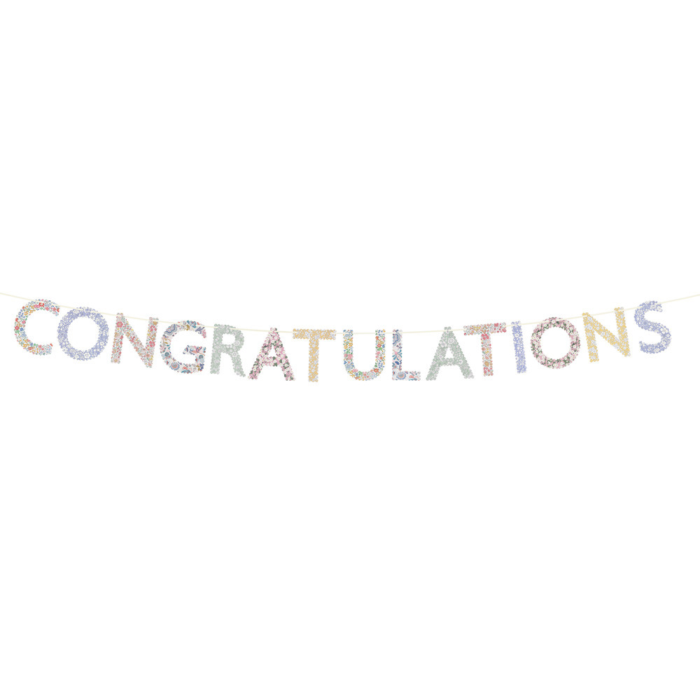 Celebrate a happy occasion in style with this charming congratulations garland. Featuring a soft, colorful mix of classic Liberty designs, it’s perfect for birthdays, anniversaries, engagements, weddings, graduations and more. The scalloped paper letter pennants are pre-strung on a sumptuous cream velvet ribbon, making it easy to hang in a doorway, on a wall, or above a mantel for an instant touch of joy.