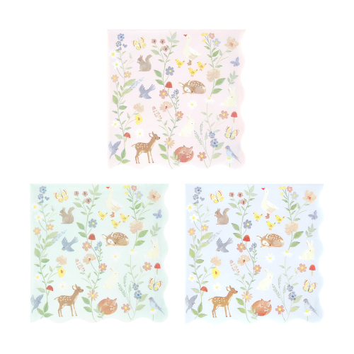 These large paper napkins feature soft watercolor animals, like geese and fawns, nestled among delicate flora, to bring gentle beauty to your party table. The waved edges add a whimsical touch. Perfect for young birthdays or baby showers.
