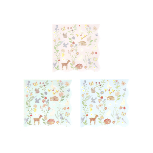 These small paper napkins feature soft watercolor animals, like geese and fawns, nestled among delicate flora, to bring gentle beauty to your party table. The waved edges add a whimsical touch. Perfect for young birthdays or baby showers.