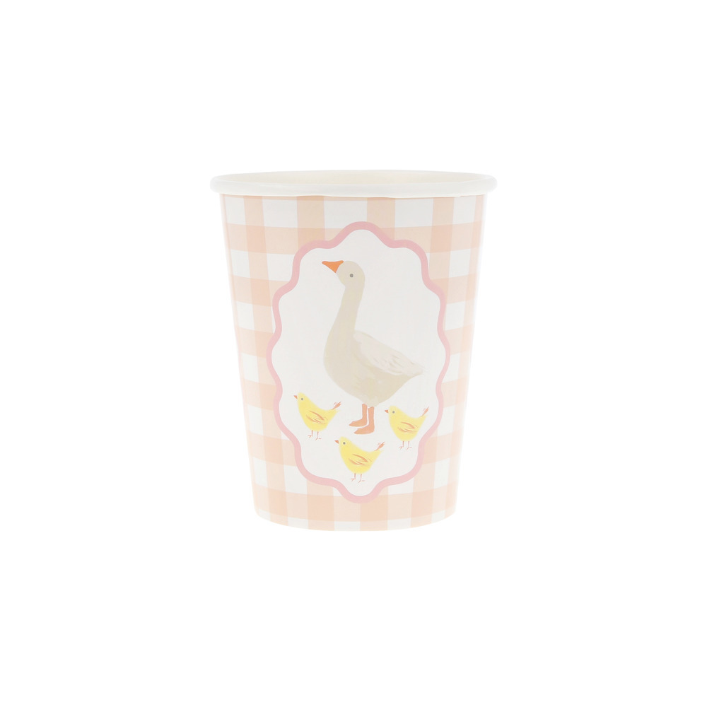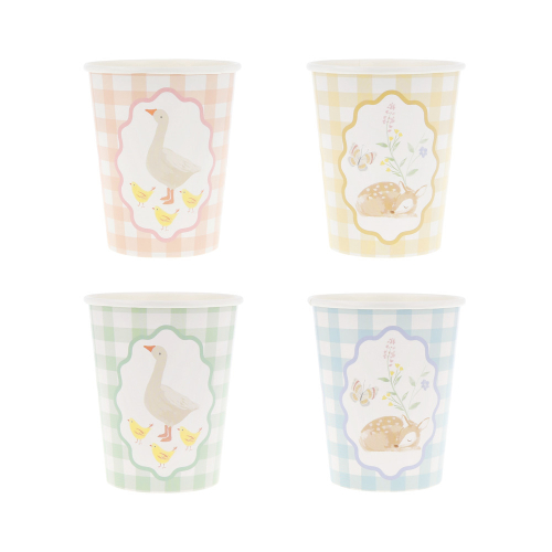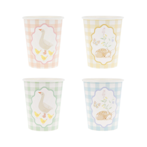 These paper cups feature soft watercolor animals, including geese, fawns, rabbits, squirrels and chicks, fawns; teamed with a timeless gingham design, to bring gentle beauty to your party table. Perfect for hot and cold drinks for young birthdays or baby showers.