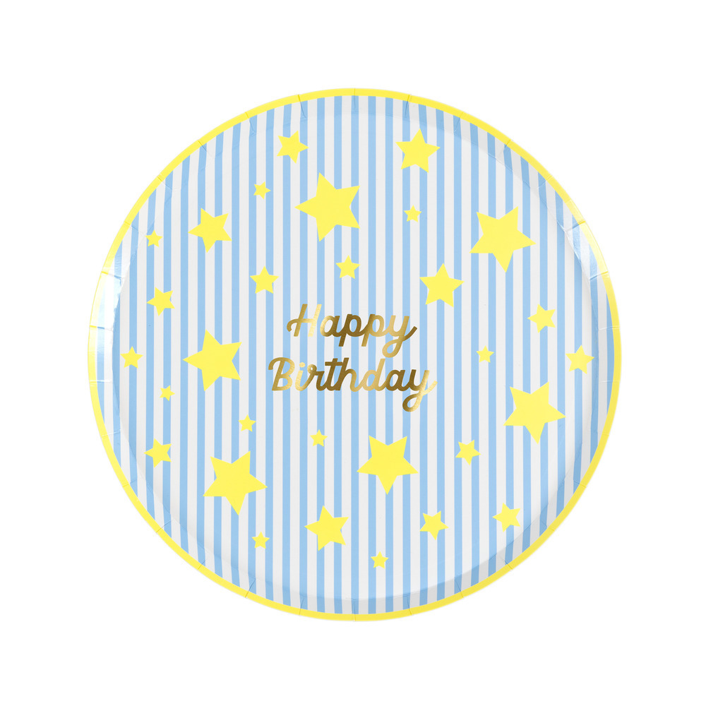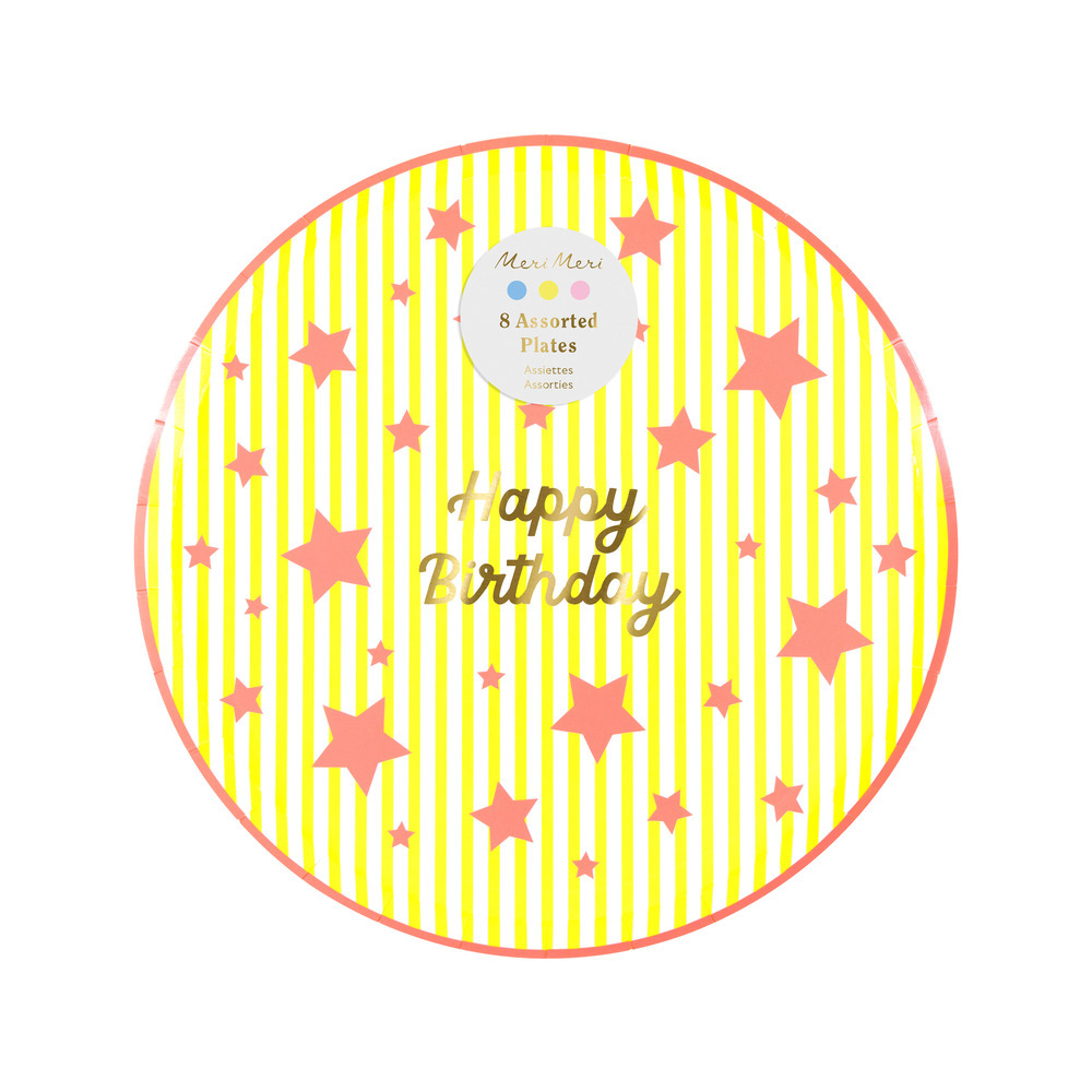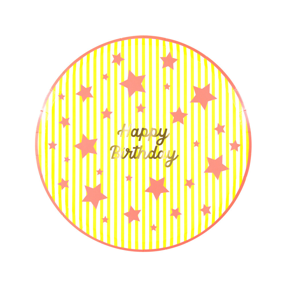 Celebrate a birthday star in style with these wonderful bright paper side plates. Each features a shiny gold “Happy Birthday” message at the center, surrounded by bold yellow, pink or blue stripes. Neon stars and matching borders add a joyful finishing touch.