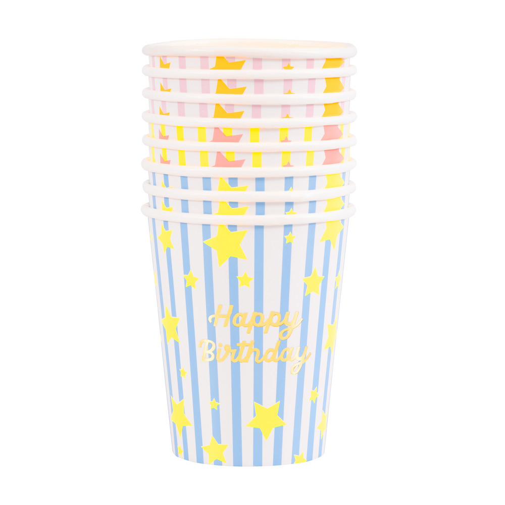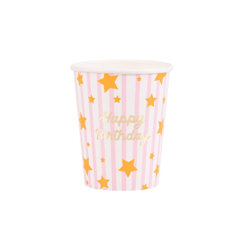 Celebrate a birthday star with these wonderful bright star paper cups. Each features a shiny gold “Happy Birthday” message at the center, surrounded by bold yellow, pink or blue stripes. Neon stars add a joyful finishing touch. Perfect for serving hot and cold drinks with a playful pop of color and delight.