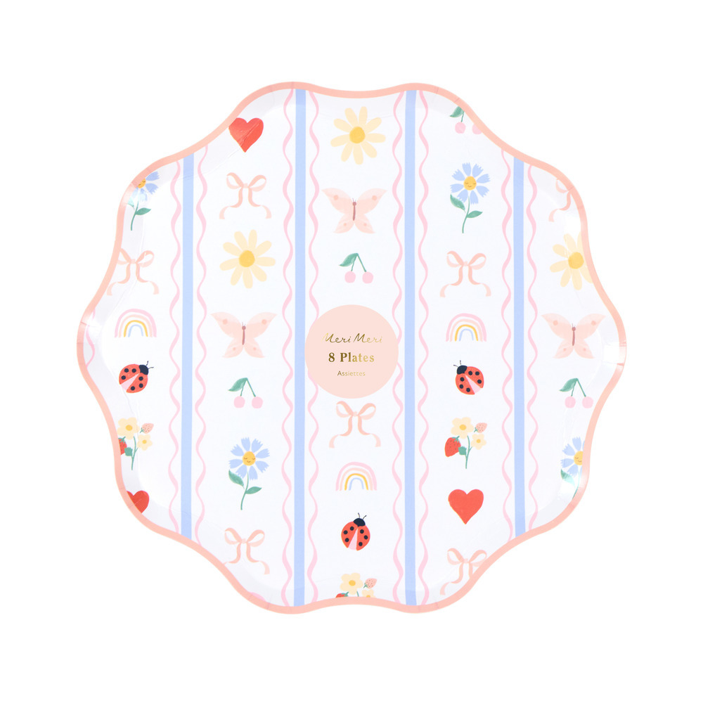Blooming with playful detail, these Little Garden paper side plates will turn every meal into a celebration. The pretty textile-inspired pattern of ladybugs, hearts, bows, flowers, cherries, butterflies and rainbows enchants in soft pink, red and blue tones. Finished with a wavy pink border and pink reverse, they look elegantly charming from all angles.