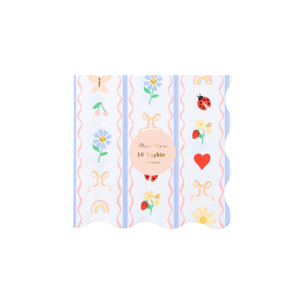 Blooming with playful detail, these Little Garden small paper napkins will turn every table into a celebration. The pretty textile-inspired pattern of ladybugs, hearts, butterflies, bows, cherries, flowers and rainbows enchants in soft pink, red and blue tones. Finished with a wavy edge and made from soft 3-ply paper, they feel delicate yet durable.