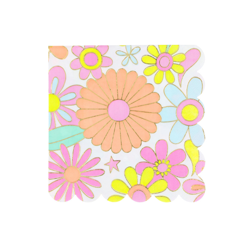 Add a burst of retro brightness to your table with these Flower Power large napkins. Inspired by the joyful patterns of the 60s and 70s and featuring bold psychedelic florals in vibrant colors and sweet neons that bring instant summer energy and a happy, carefree vibe to any celebration; perfect for 60s or 70s themed parties, sunny gatherings, or fun entertaining with kids, teens, and adults.