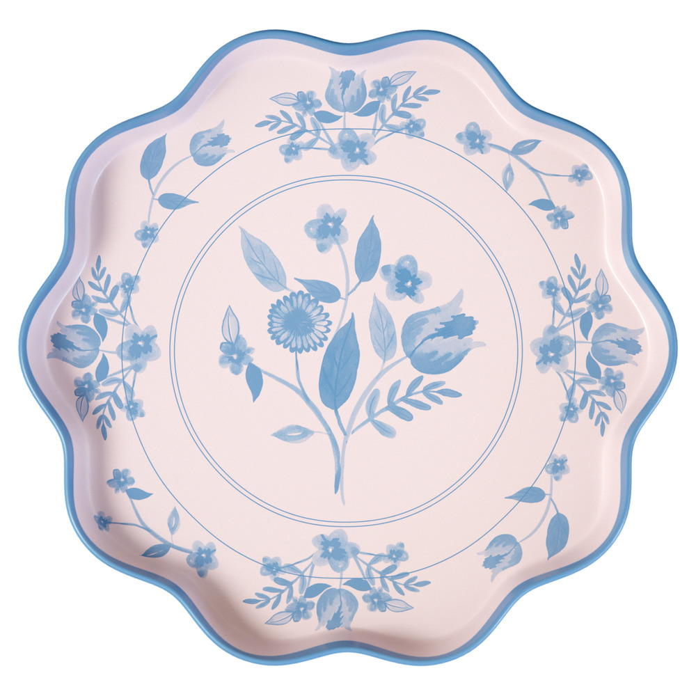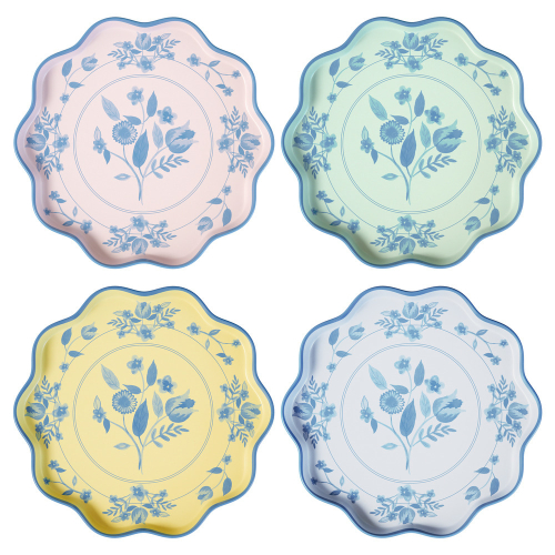 Create a sophisticated table setting with this set of pastel reusable large plates. Soft shades of pink, blue, green and yellow, provide a fresh backdrop for delicate cobalt blue botanical illustrations. Inspired by vintage dinnerware, the design brings timeless style, while a waved edge adds refined detail.