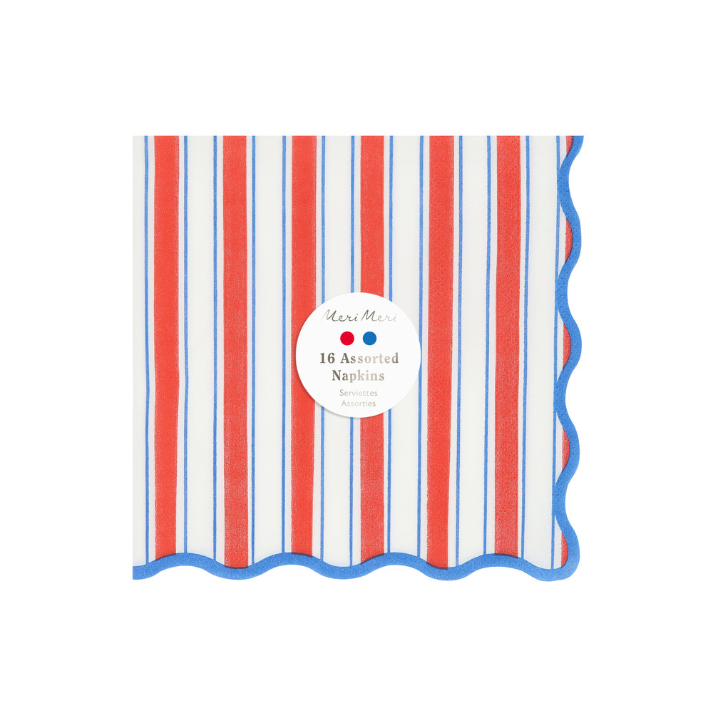 Set sail for stylish celebrations with these striking large paper napkins. Featuring bold red, white and blue stripes and a delightful waved edge for a breezy effect, they'll bring seaside charm to any table. Perfect for chic summer gatherings or playful children’s parties with a nautical theme, this design captures the spirit of sunny days, salty air and effortlessly elegant entertaining.
