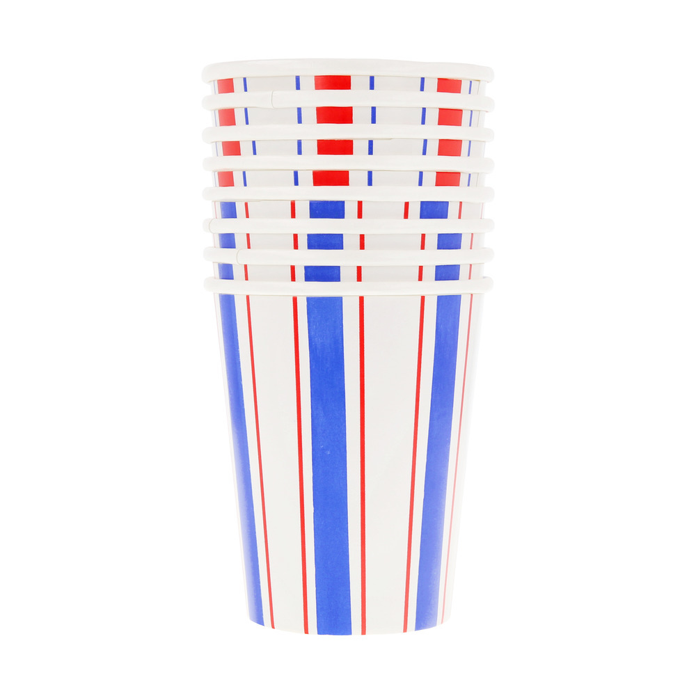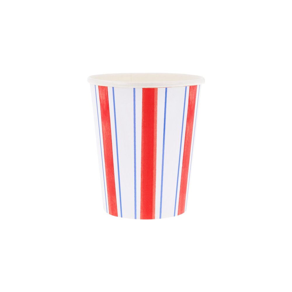Set sail for stylish celebrations with these striking paper cups. Featuring bold red, white and blue stripes, they'll bring seaside charm to any table. Perfect for cold or hot drinks at chic summer gatherings, or playful children’s parties with a nautical theme, this design captures the spirit of sunny days, salty air and effortlessly elegant entertaining.