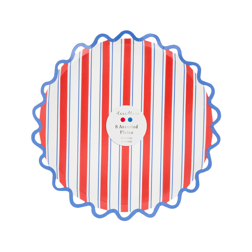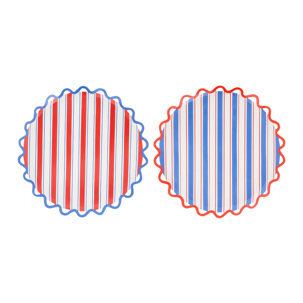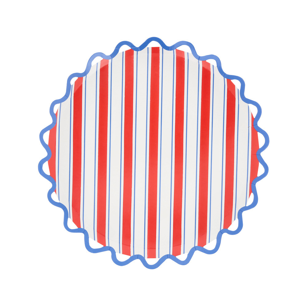 Set sail for stylish celebrations with these striking paper side plates. Featuring bold red, white and blue stripes and a delightful waved edge for a breezy effect, they'll bring seaside charm to any table. Perfect for chic summer gatherings or playful children’s parties with a nautical theme, this design captures the spirit of sunny days, salty air and effortlessly elegant entertaining.