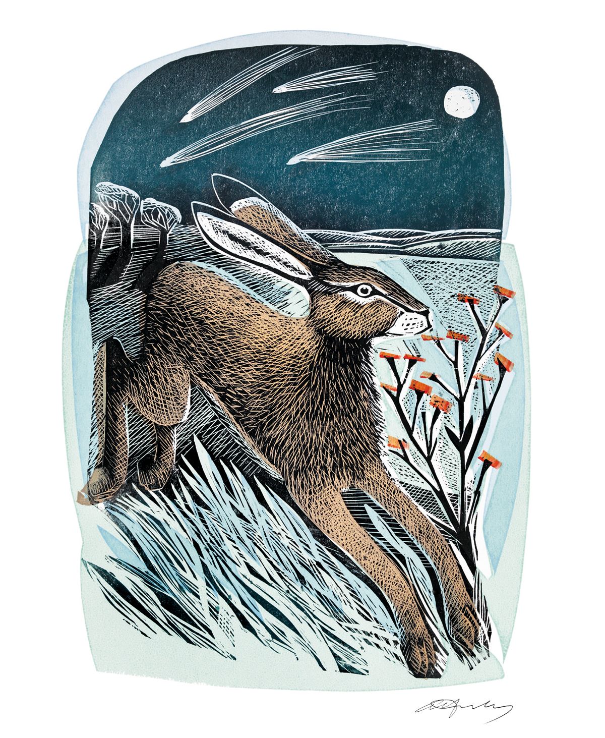 Angela Harding is a printmaker working from her rural studio in Rutland. Her works are inspired by her love of birds, animals and the beauty of the British Countryside.