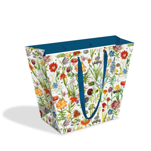 • A wide tapered bag format with reinforced base and extended ribbon handles.