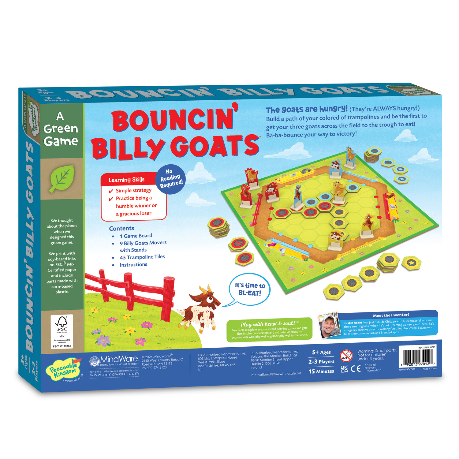 These goats are famished, and there's only one way to reach the feast: bounce their way across a colourful path of trampolines. A playful twist of strategic tile placement and movements keeps every player engaged until their goats are munching happily. Leap into fun with quick-play game that customers just might declare the GOAT! Ages 5+, 2-3 players