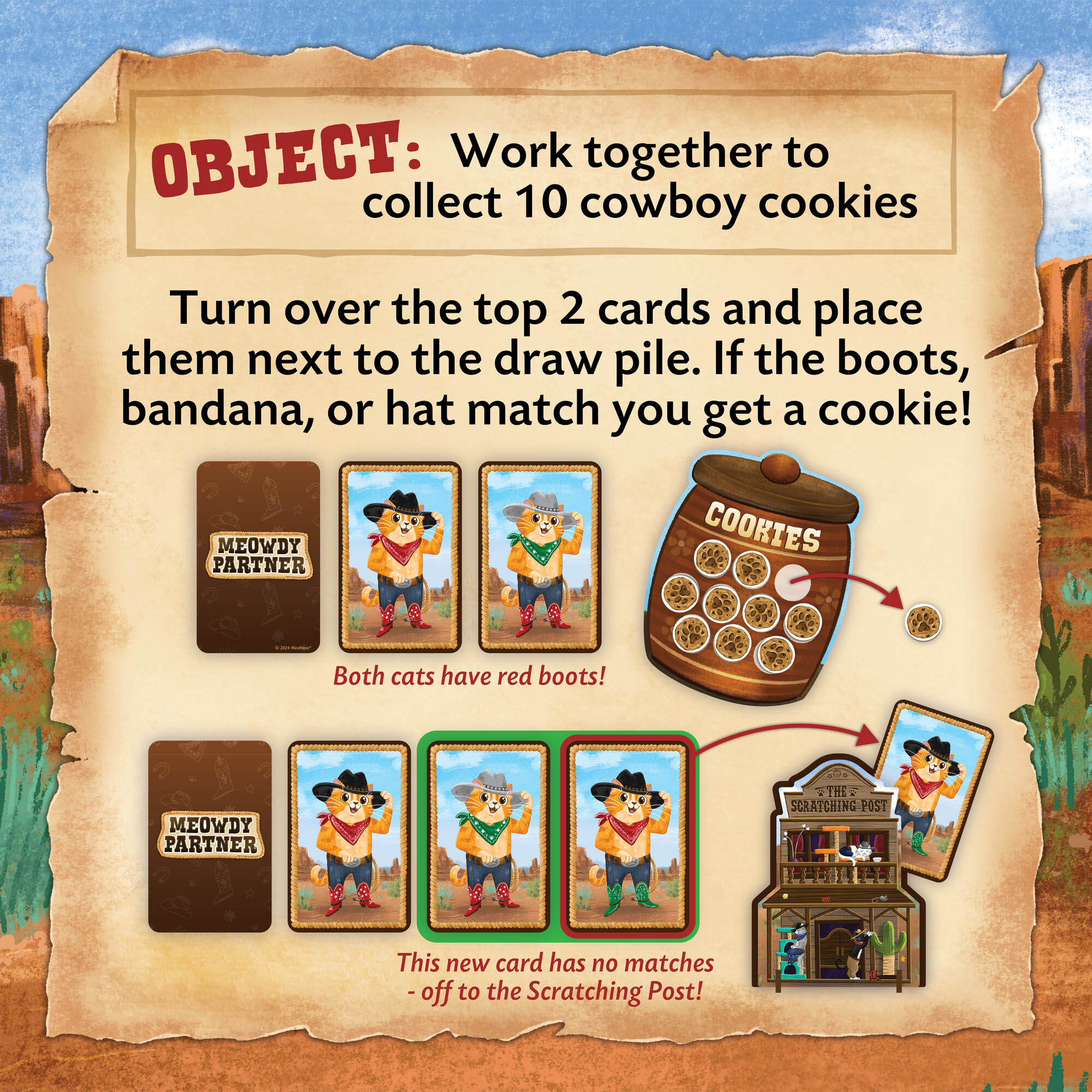Saddle up for a heartwarming adventure with Meowdy Partner, the game where young cowboys and cowgirls learn the value of cooperation and kindness in a ranch-themed wonderland. Perfect for preschoolers and kindergartners. Meowdy Partner encourages kids to work together as they match attributes on cowboy cat cards and collect a cowboy cookie for ech match. But they've got to look closely, as each card with no matched gets added to the Scratching Post. If a player takes the last cookie before three cards make it to the Scratching Post, everyone wins.