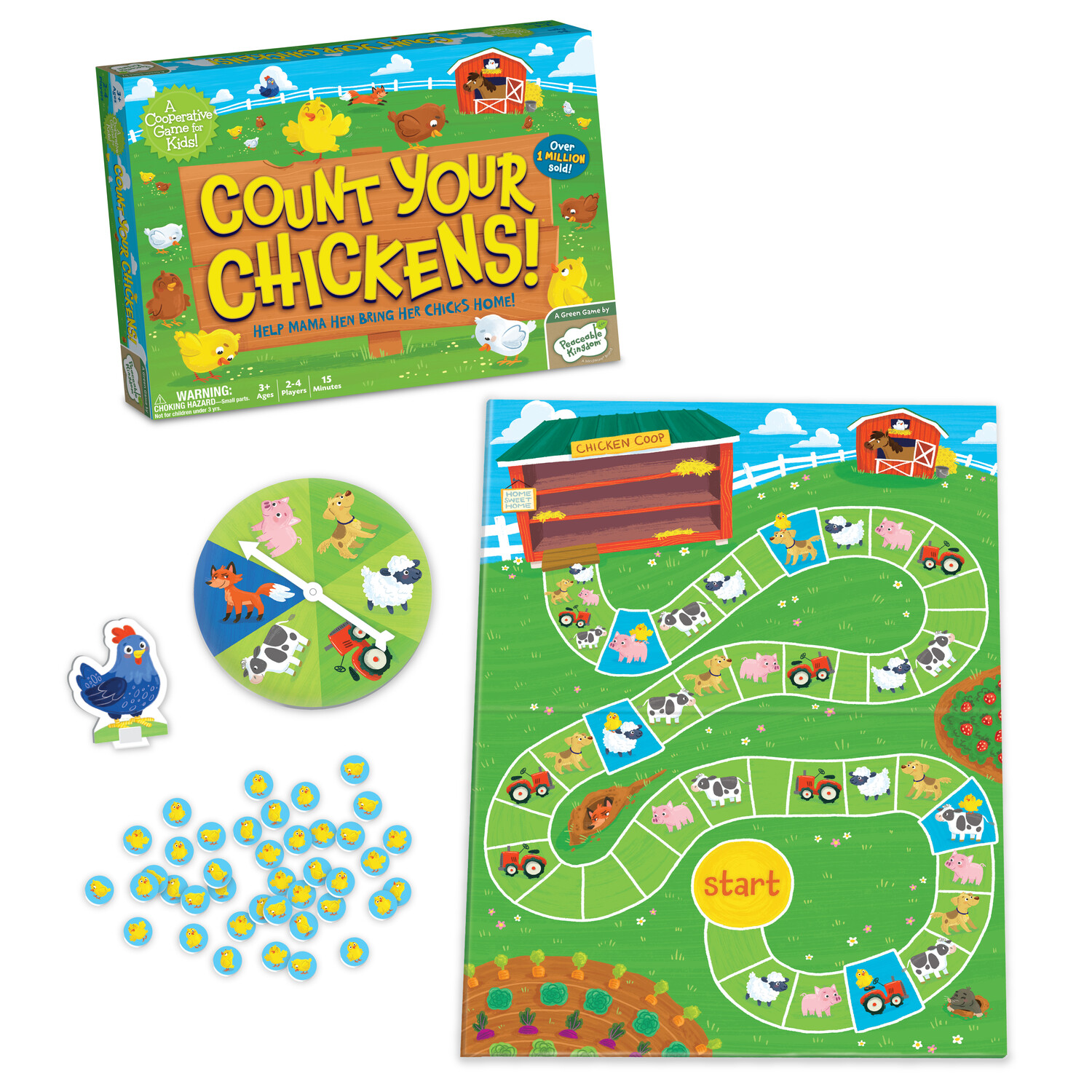 The baby chicks have flown the coop. Players help Mother Hen collect her chicks and bring them back to the coop. Spin and move, count the number of spaces, and collect that number of chicks. Take turns, work together and watch out for the fox! Collect all the chicks by the time Mother Hen reaches the end and everyone wins!