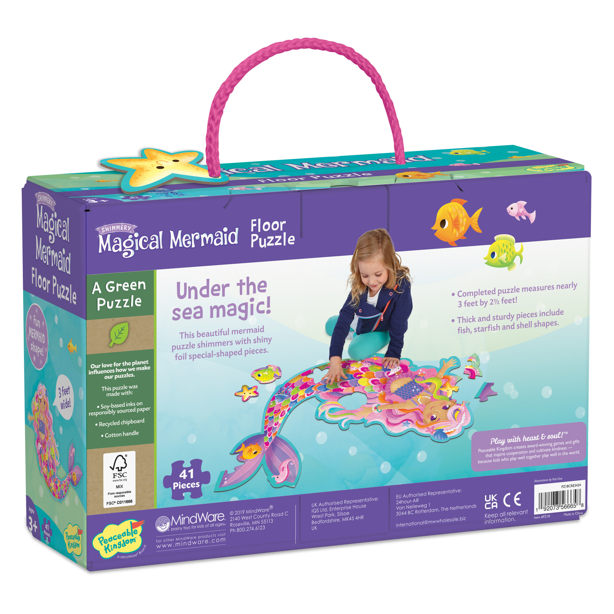 These adorably designed floor puzzles measure approximately 2 x 3 feet with unique puzzle shapes for extra fun. Puzzle pieces are thick and sturdy and the box includes a corded handle for easy carrying.