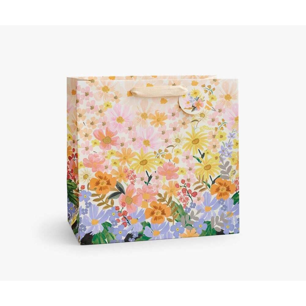 Illustrated paper gift bags with ribbon handles and a coordinating gift tag with "to" and "from" on the back.