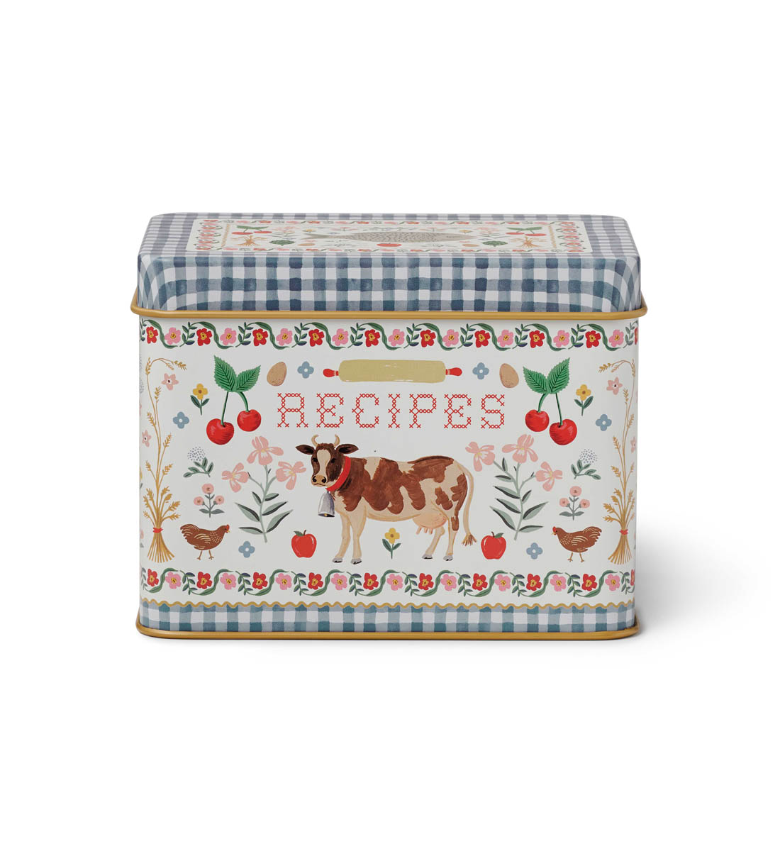 Illustrated recipe tins with metallic accents, plus 12 dividers and 24 coordinating recipe cards.