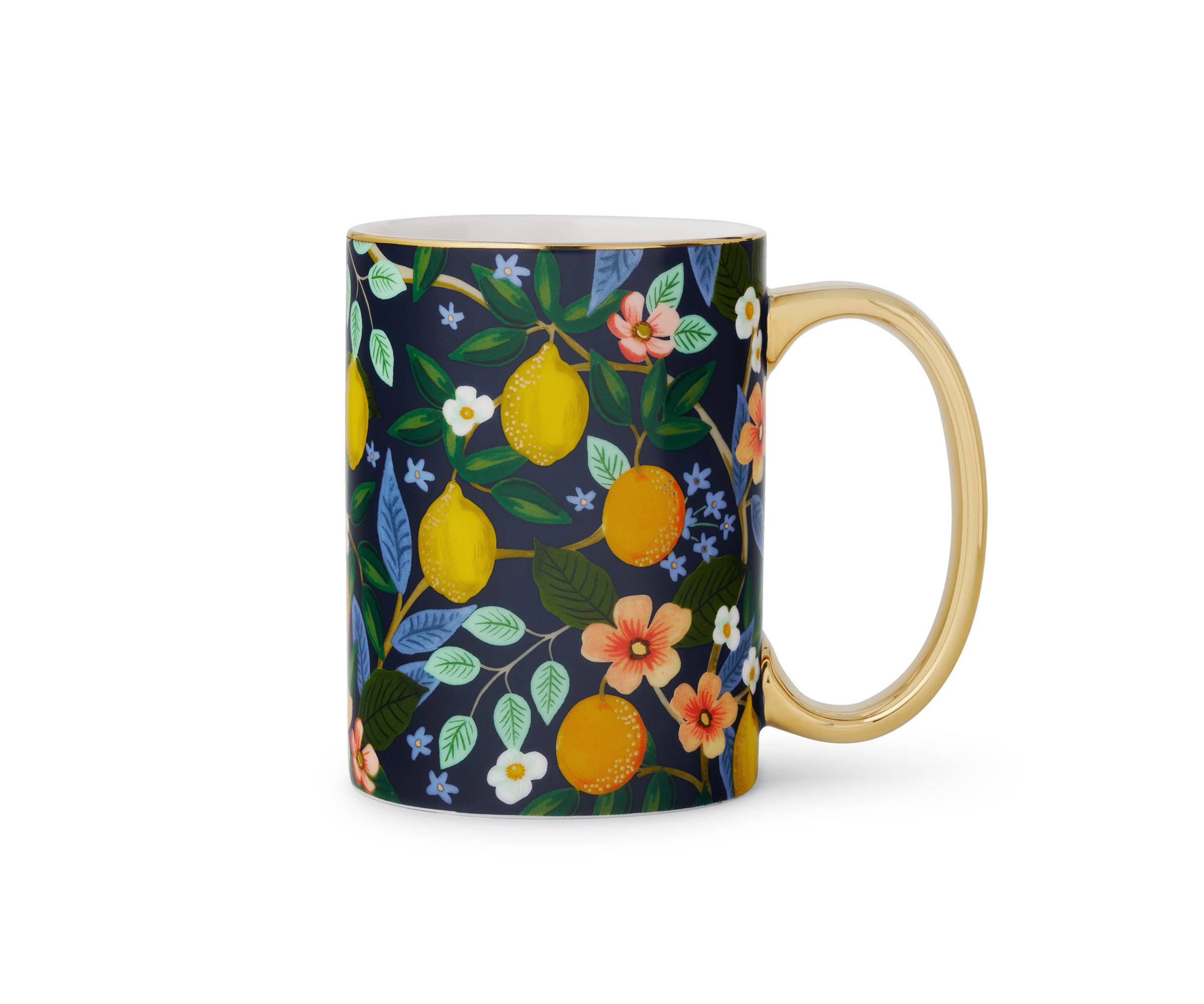 These porcelain mugs feature illustrated designs and a gilded rim and handle to add a little something special to your favorite beverage.