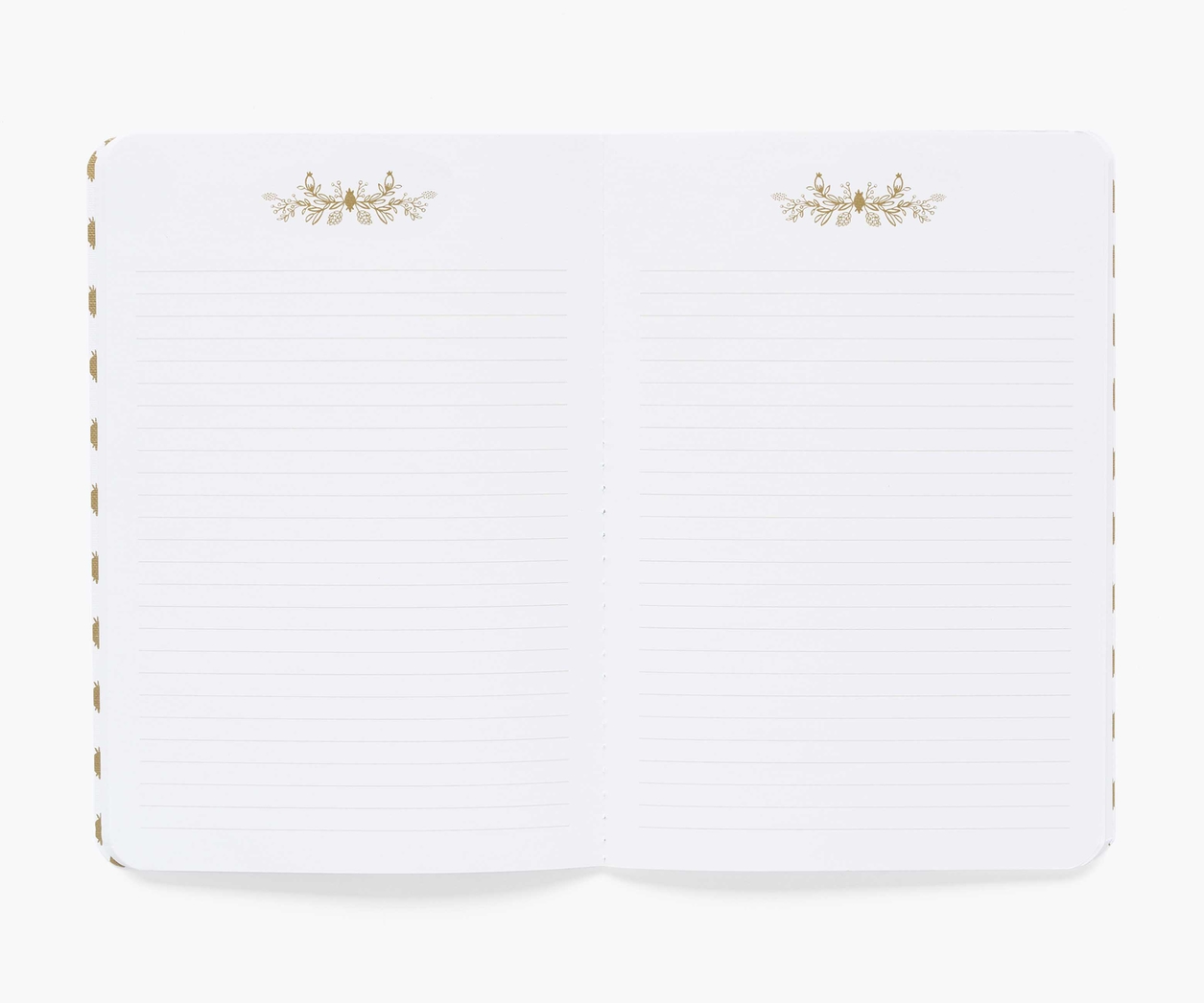 Notebooks with illustrated covers on canvas paper with gold foil accents and metallic gold interior.