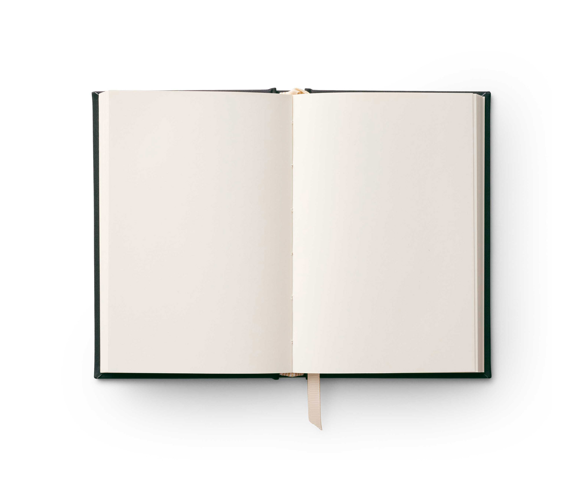 Hardcover journals wrapped in book cloth with floral embroidery and gold foil month on front covers, and a grosgrain ribbon bookmark.