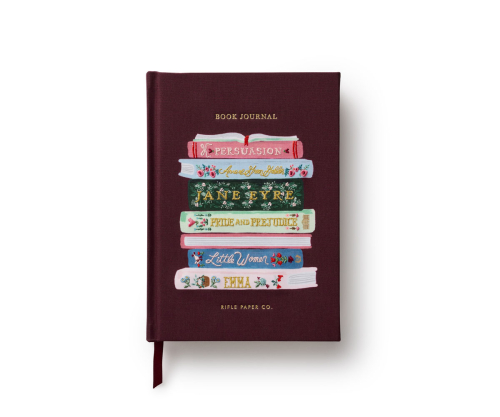 Guided hardcover journals wrapped in book cloth with embroidered design; inside find sections for books to read, a reading log, books borrowed, books lent out, 50 book review entries, and reading notes, plus a grosgrain ribbon bookmark and two paper bookmarks.