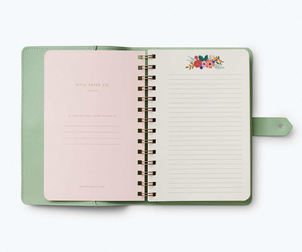 Refillable spiral journal with illustrated cover, button closure, and pockets for storage.