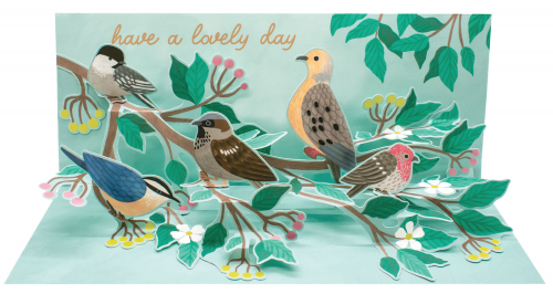 Panoramics are horizontal cards designed to showcase a festive pop-up scene. Cards may integrate pull-tab movement along with sound or light.