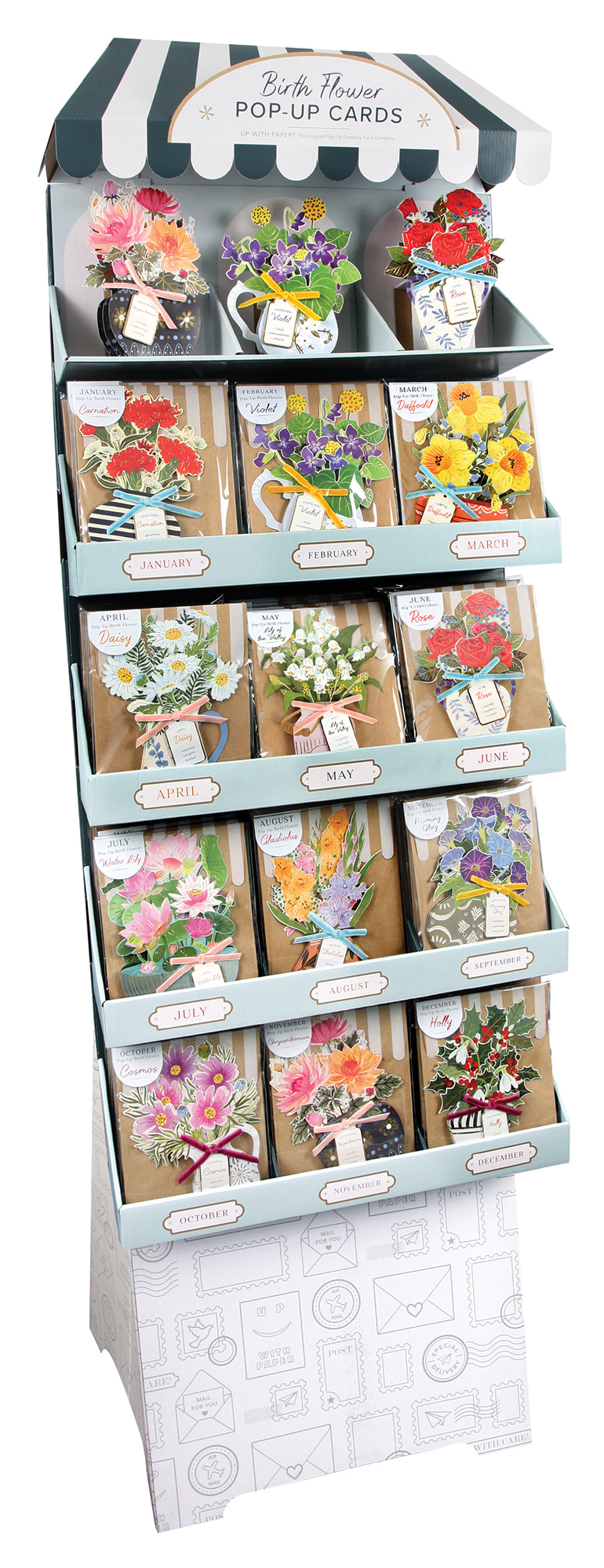 Pop-up flowers dedicated to each month are paired with a tag highlighting the recipient's greatest qualities. Each card is finished with gold foiled accents and a velvet bow. All card sizes vary and fit into a coordinating 5 x 7 inches kraft paper envelope with white ink and scalloped details. Cards fold flat for mailing and stand open for display.