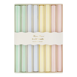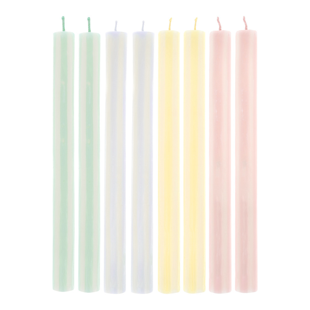Make a statement with stripes! This set of eight striped wax candles, in a fresh mix of green, blue, yellow and soft pink, paired with classic ivory, bring contemporary charm with a classic twist to any springtime setting. Each candle features a matching colored wick, it’s thoughtful details like this that elevate the everyday.