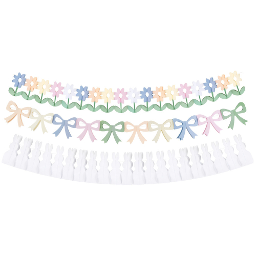 Celebrate Easter with a joyful burst of color and charm, thanks to this delightful set of three paper garlands. Featuring sweet bunnies, spring-fresh flowers and chic bows, they beautifully bring together everything we love about this season. Drape all three together for a layered statement look or hang separately on windows, doorways, mantels or in the garden to spread the cheer throughout your space.