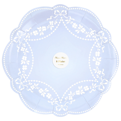 Inspired by classic elegance and designed to delight, these cornflower blue paper dinner plates feature white ornamental patterns echoing rococo details. Their sculptural wavy edges, reminiscent of vintage dinnerware, are finished with delicate pearl-like accents for subtle sophistication. A matching blue reverse completes the look, creating a beautifully coordinated table from every angle.