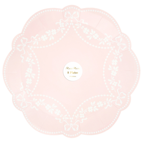 Inspired by classic elegance and designed to delight, these pastel pink paper dinner plates feature white ornamental patterns echoing rococo details. Their sculptural wavy edges, reminiscent of vintage dinnerware, are finished with delicate pearl-like accents for subtle sophistication. A matching pink reverse completes the look, creating a beautifully coordinated table from every angle.
