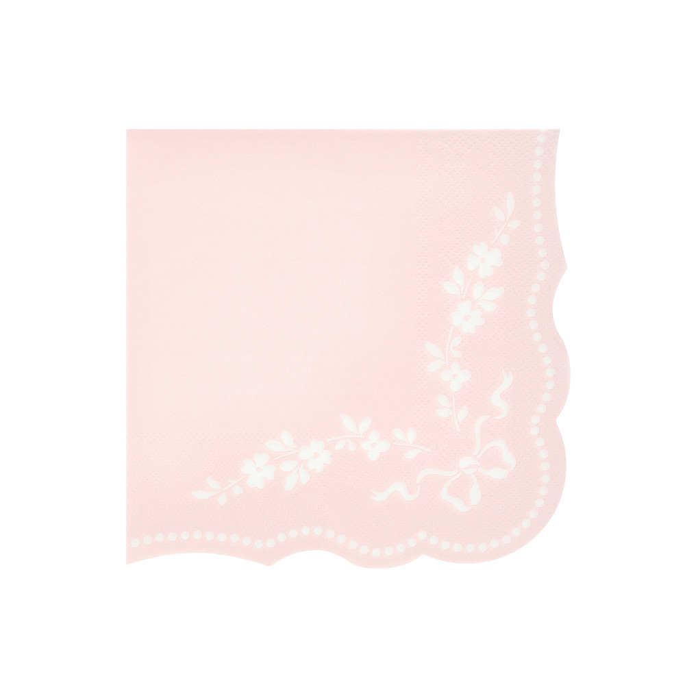 Inspired by classic elegance and designed to delight, these pastel pink large paper napkins feature white ornamental patterns echoing rococo details. Their sculptural wavy edges are finished with delicate pearl-like accents for subtle sophistication.