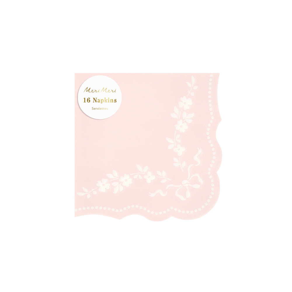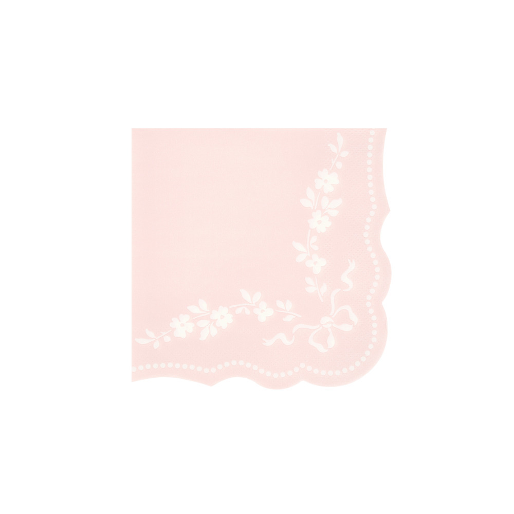 Inspired by classic elegance and designed to delight, these pastel pink small paper napkins feature white ornamental patterns echoing rococo details. Their sculptural wavy edges are finished with delicate pearl-like accents for subtle sophistication.