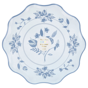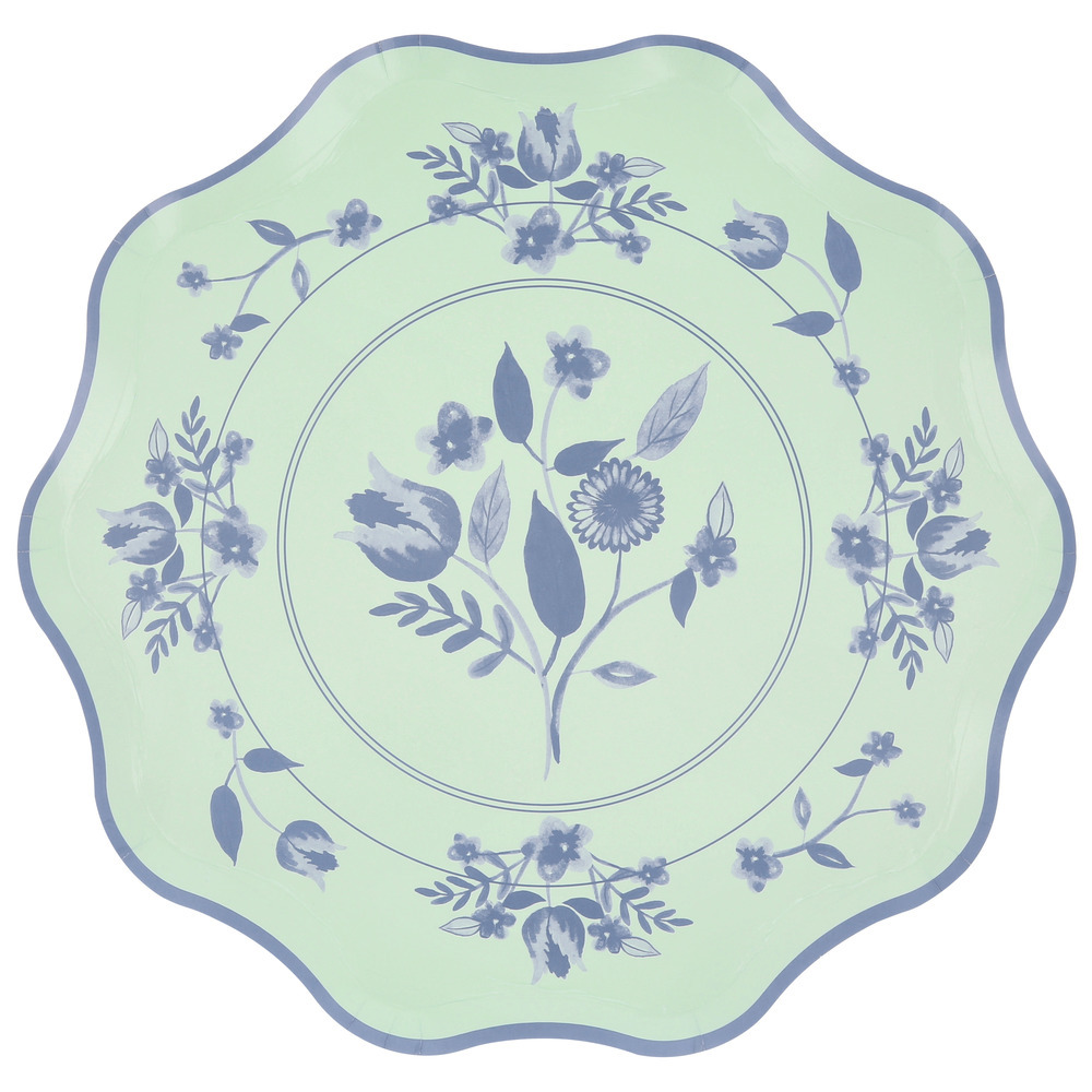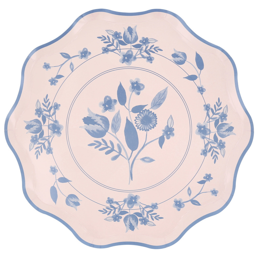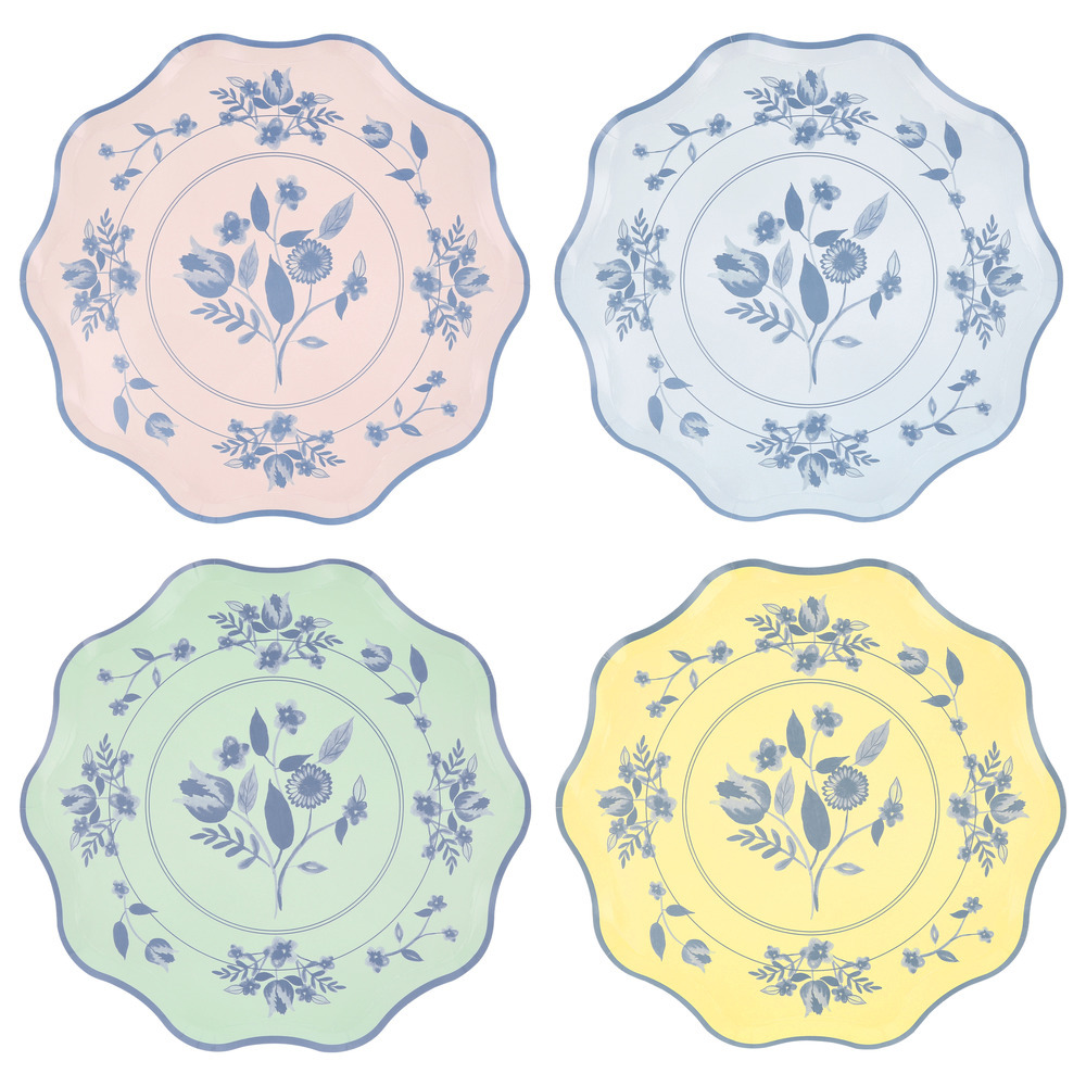 Create a sophisticated table setting with this set of pastel paper dinner plates. Soft shades of pink, blue, green and yellow, provide a fresh backdrop for delicate cobalt blue botanical illustrations. Inspired by vintage dinnerware, the design brings timeless style, while a waved edge adds refined detail. Coordinating pastel backs complete the look from every angle.