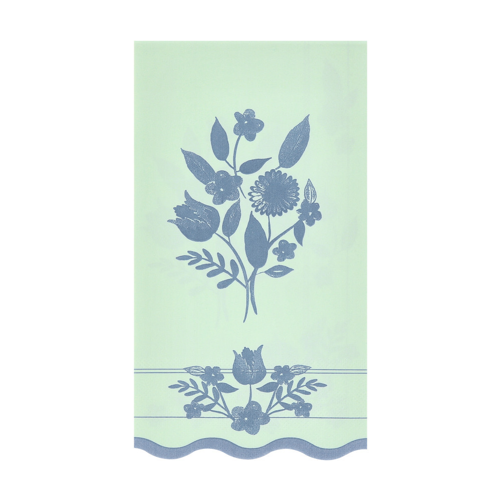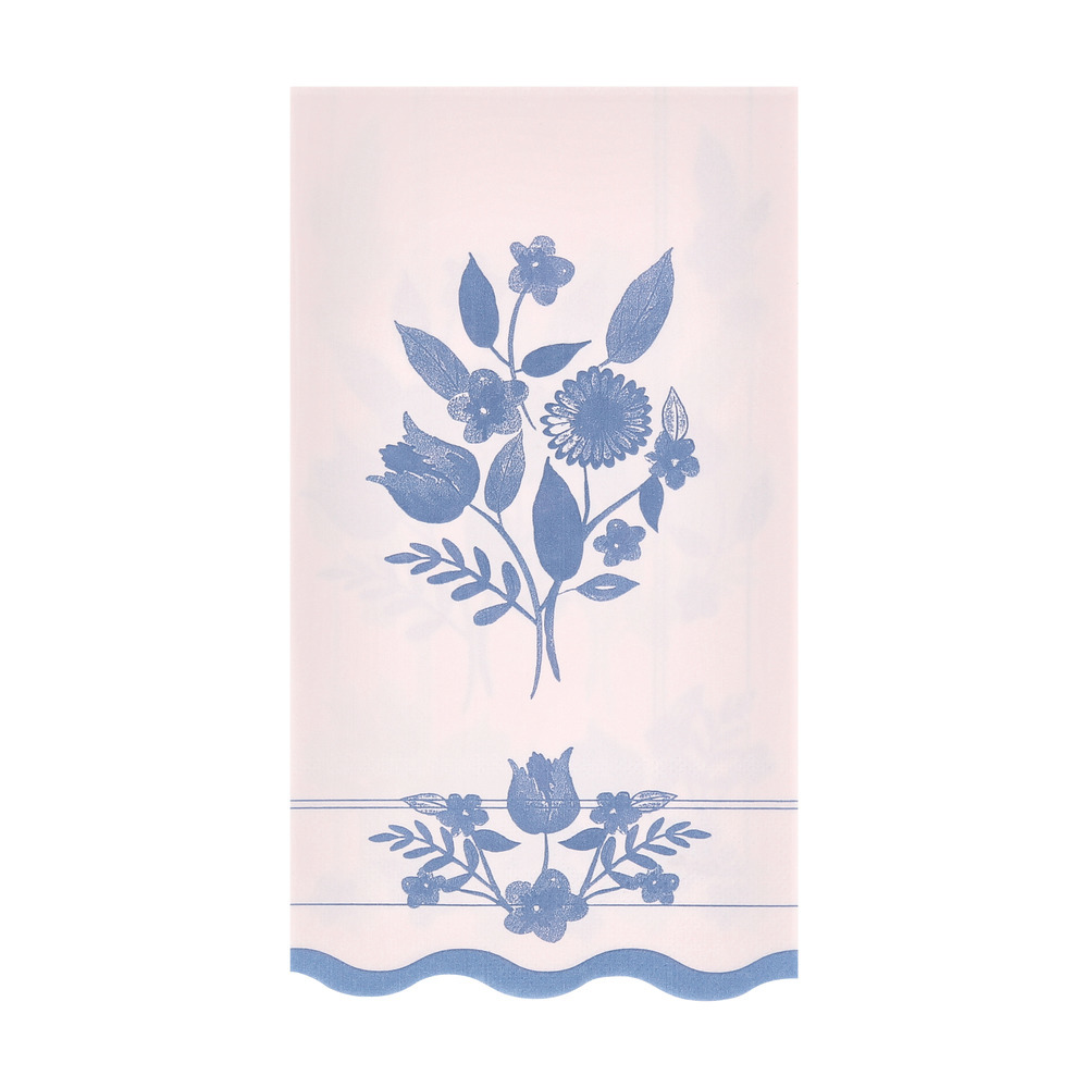 Add a sophisticated touch to your home with this set of pastel paper guest towels. Soft shades of pink, blue, green and yellow, provide a fresh backdrop for cobalt blue botanical illustrations inspired by vintage dinnerware. A wavy edge lends sculptural charm.